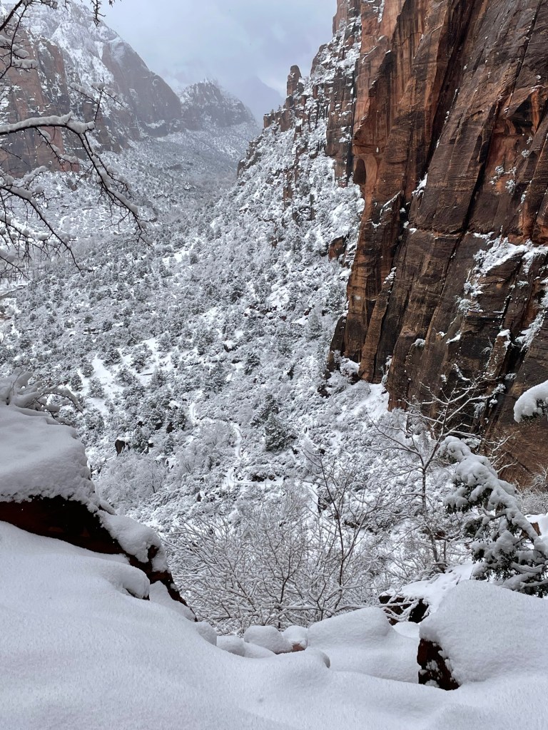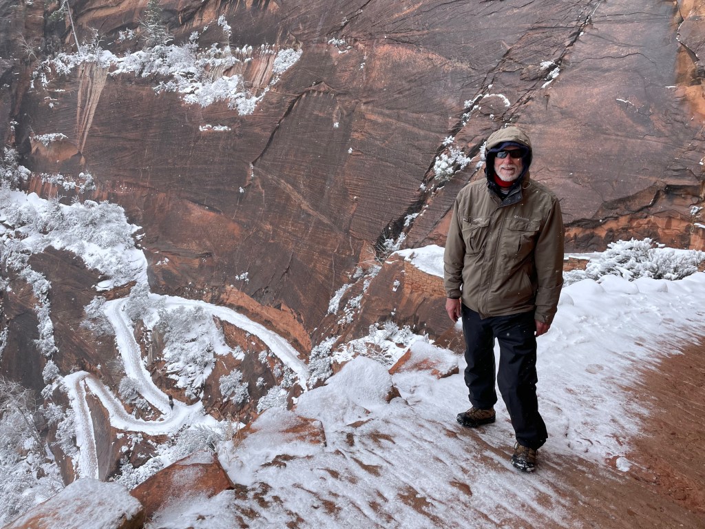 That night, I lay in bed, tossing and turning, all the while dreading tomorrow’s hike up the West Rim Trail to Angel’s Landing. We had hiked this trail in summer, but winter would be different. I imagined what it might be like to lose the trail under all of that snow. What if I stepped off the trail into thin air? The hike has an elevation gain of 1,000 feet and is so dangerous, people have to get a permit. Our permit was for February 26. I looked over at Herb, who was sleeping peacefully. “He doesn’t seem concerned, why am I?” I took comfort seeing him so relaxed, and finally dozed off.
