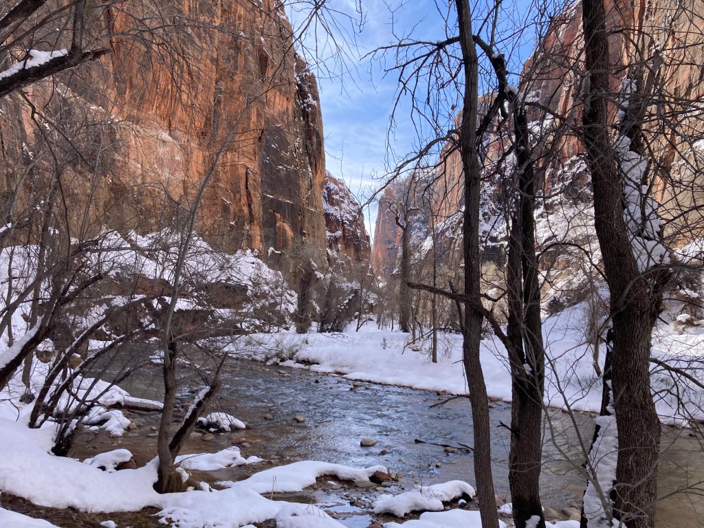I knew I was in for trouble when we attempted our first hike along the Virgin River. The trail was snow-covered and icy. Herb had borrowed a pair of crampons (ice cleats) from my brother in anticipation of this condition. I had not thought ahead. Instead, I used my hiking poles to stabilize myself on the trail and my hands became very sore. The beautiful scenery along the river helped me forget my pain.