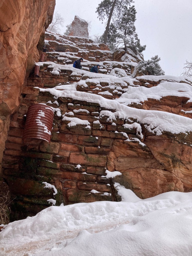 Scout’s Lookout usually offers a great view of Zion Canyon. But today visibility was limited because the clouds opened and snow pelted the area. Nearby, a group of four guys dared one another to climb up the chain rope to the top of Angel’s Landing. Common sense ruled. My adventurer husband also decided to turn back since we could only see about twenty feet in front of us.